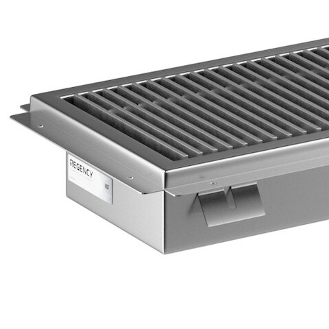 This Regency floor trough comes with a removable 3/16" x 1" subway-style grating that boasts an even 9/16" spacing between each bar. This spacing permits fluids to easily flow through, and it blocks potential clogs while enabling equipment and casters to roll over the trough without getting stuck. Plus, this item was constructed with a convenient creased design to ensure proper draining into its 3" long plumbing sleeve, which accommodates waste pipes up to 4" in diameter.