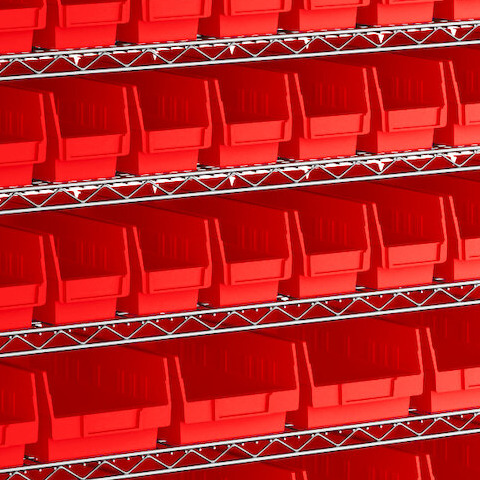 - Includes 12 shelves, 4 posts, and 118 red polypropylene bins