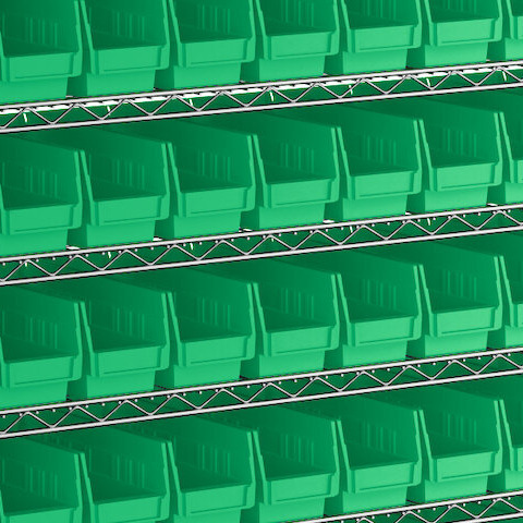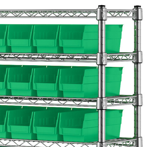 - Includes 12 shelves, 4 posts, and 143 green polypropylene bins