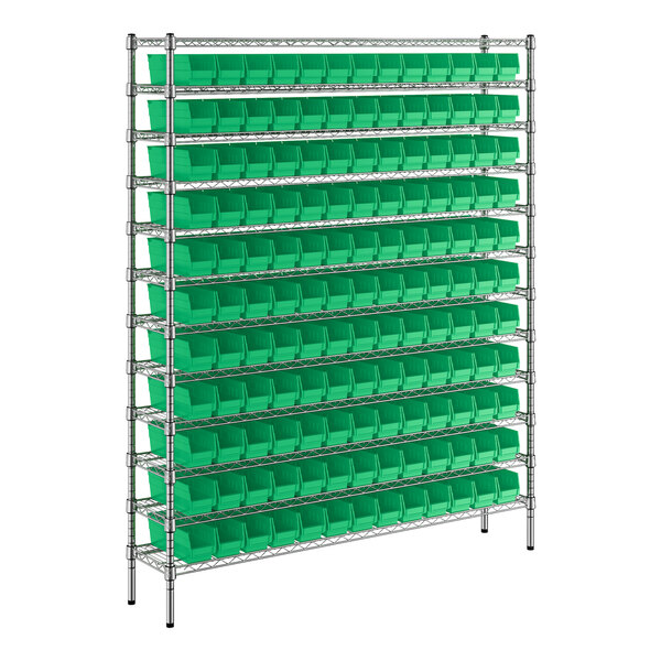 View All ItemsMaintain an organized industrial space with this Regency 12" x 60" x 74" wire shelving unit with 143 green bins.