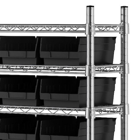 The NSF shelving unit is made of a durable, chrome-plated metal with a clear epoxy coating. It includes 12 shelves, 4 posts, and 88 black injection-molded polypropylene bins, all of which are made to commercial-grade specifications to withstand industrial conditions and for your business's long-lasting use. Each shelf can hold up to an impressive 600 lb. of evenly distributed weight.