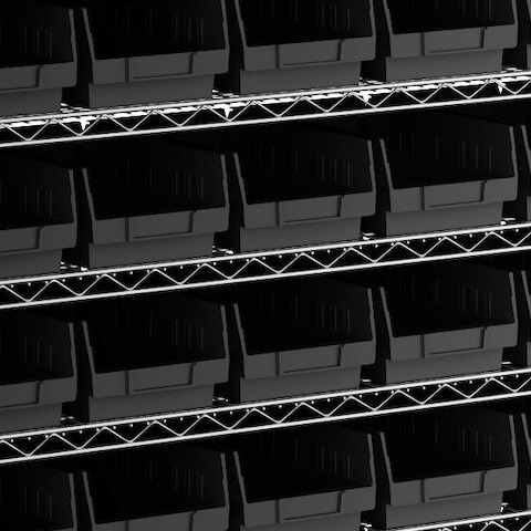 - Includes 12 shelves, 4 posts, and 88 black polypropylene bins