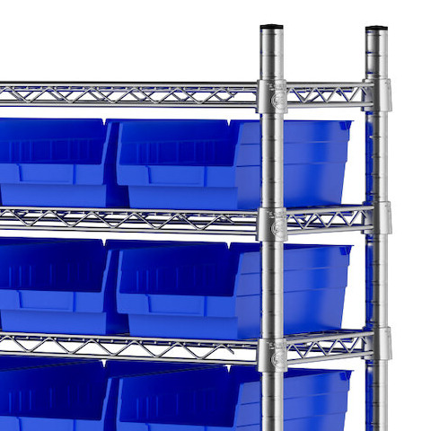 The NSF shelving unit is made of a durable, chrome-plated metal with a clear epoxy coating. It includes 12 shelves, 4 posts, and 88 blue injection-molded polypropylene bins, all of which are made to commercial-grade specifications to withstand industrial conditions and for your business's long-lasting use. Each shelf can hold up to an impressive 600 lb. of evenly distributed weight.