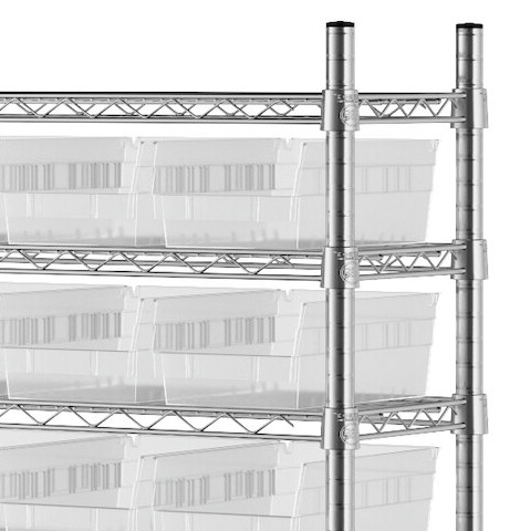 The NSF shelving unit is made of a durable, chrome-plated metal with a clear epoxy coating. It includes 12 shelves, 4 posts, and 88 clear injection-molded polypropylene bins, all of which are made to commercial-grade specifications to withstand industrial conditions and for your business's long-lasting use. Each shelf can hold up to an impressive 600 lb. of evenly distributed weight.