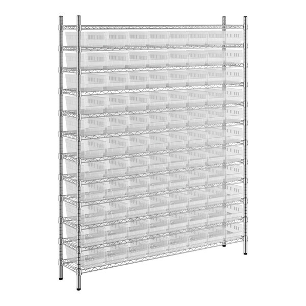 View All ItemsMaintain an organized industrial space with this Regency 12" x 60" x 74" wire shelving unit with 88 clear bins.