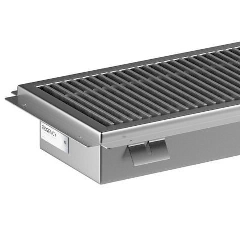 This Regency floor trough comes with a removable 3/16" x 1" subway-style grating that boasts an even 9/16" spacing between each bar. This spacing permits fluids to easily flow through, and it blocks potential clogs while enabling equipment and casters to roll over the trough without getting stuck. Plus, this item was constructed with a convenient creased design to ensure proper draining into its 3" long plumbing sleeve, which accommodates waste pipes up to 4" in diameter.