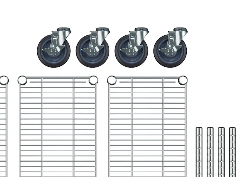 This kit includes (4) 64" mobile posts, (4) 12" x 72" shelves, and (16) pairs of split sleeves. This versatile unit allows you to create a convenient storage solution for your janitorial closet, warehouse, or walk-in cooler. This unit requires assembly.