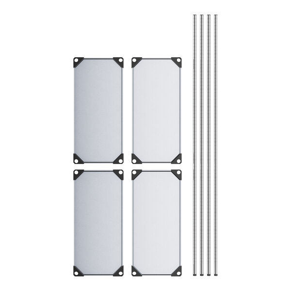 This kit includes (4) 74" stationary posts, (4) 14" x 30" solid galvanized steel shelves, and 16 pairs of split sleeves. The included split sleeves make assembly a breeze. To assemble, simply snap two split sleeves around each post at one of the incrementally notched lines. After you snap the split sleeves on, fit the shelf down over each post to hold it in place.