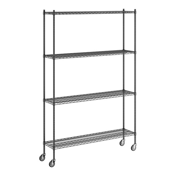 View All ItemsKeep your storage area organized with this Regency 14" wide NSF black epoxy mobile wire shelving starter kit with 4 shelves!