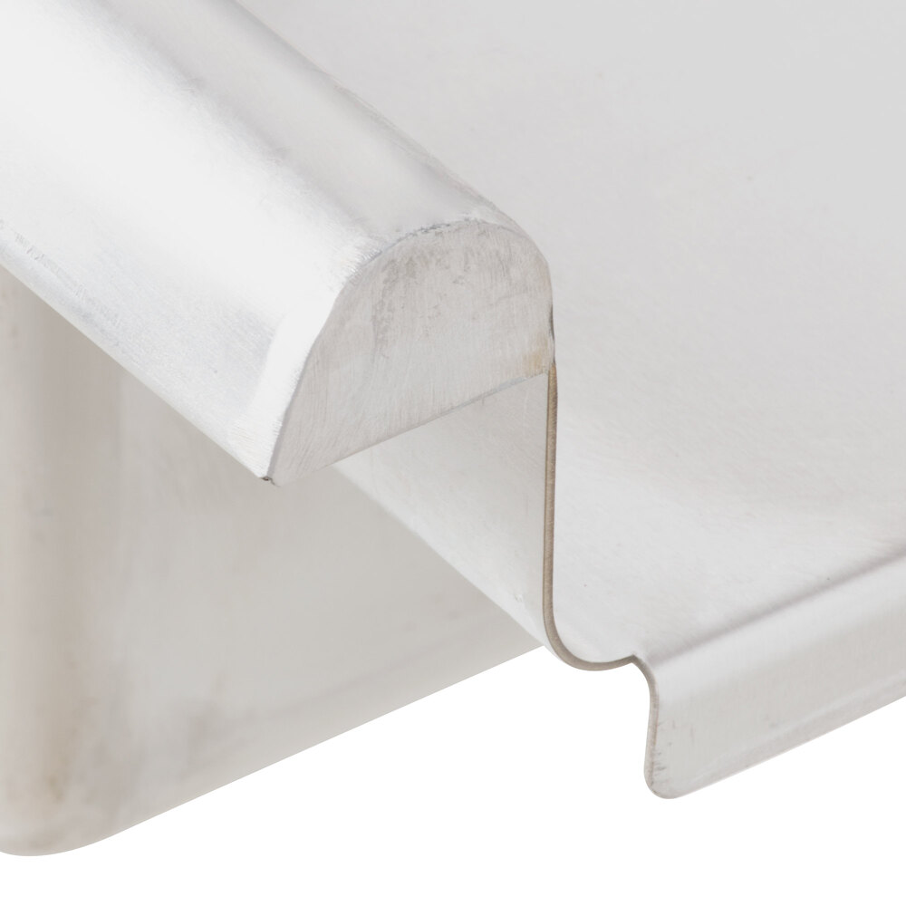 A 1 1/2" rolled edge keeps dishes stationary after wash and makes it more comfortable for staff to reach across the table if they need to retrieve dishes.