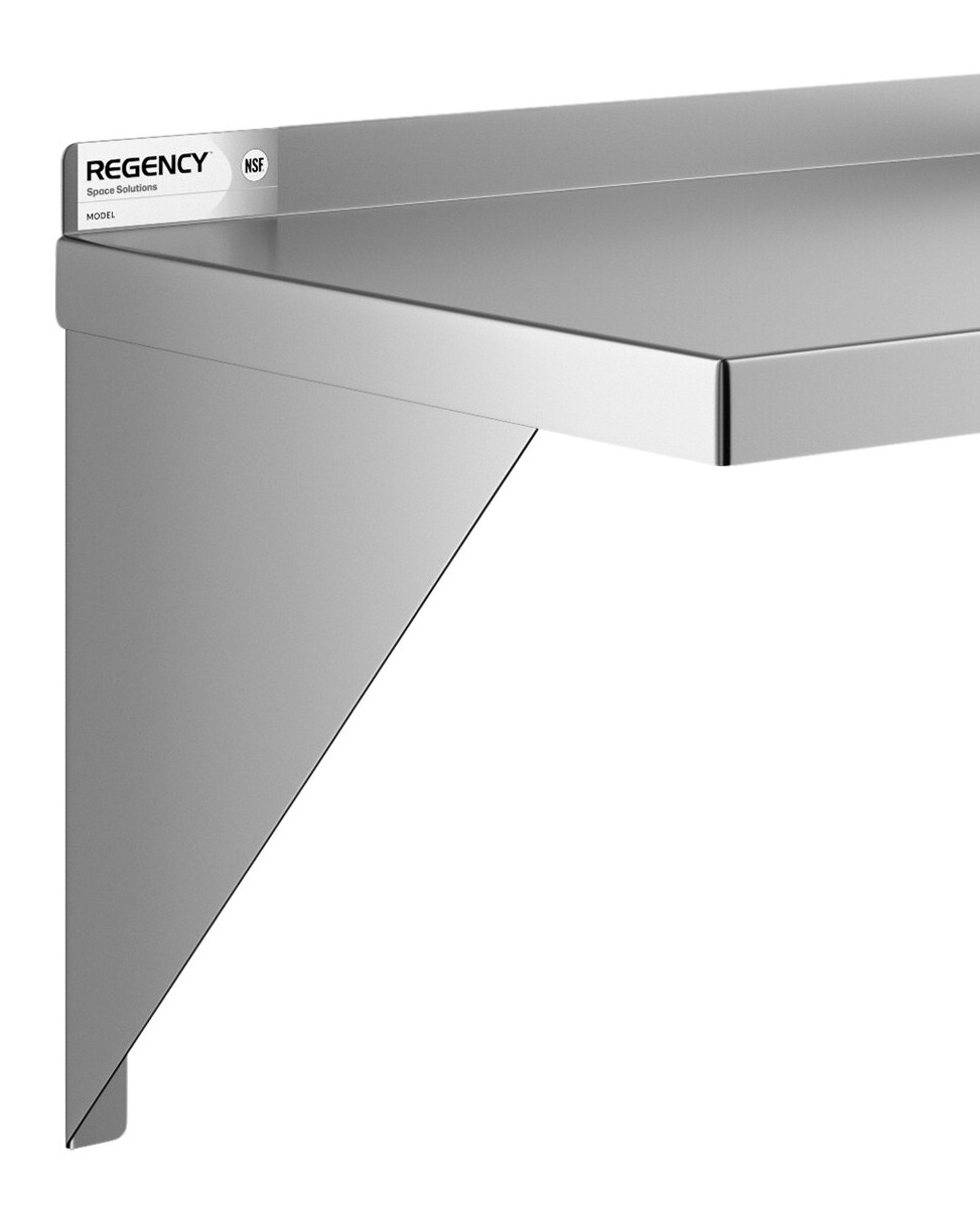Keep food, dishes, or other small items from cluttering your work area with the Regency stainless steel heavy-duty wall shelf. Made with durable materials, this shelf is designed for use in the busiest restaurant, cafeteria, or other foodservice establishment. Because the support brackets attach directly to the walls, you can keep all your most used items within easy reach without taking up valuable counter space.