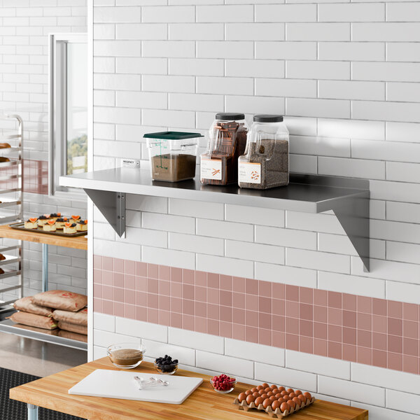 To add extra storage above your work table or countertop, look no further than the Regency 18 gauge stainless steel 15” x 48” solid wall shelf. Simply attach the shelf to your wall, and you can keep your most used ingredients, supplies, and hand tools within reach without using up all of your valuable counter space. Also, thanks to its stainless steel construction, this shelf is easy to clean and maintain.