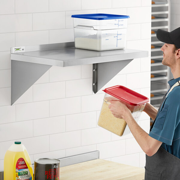 Keep food, dishes, or other small items from cluttering your work area with the Regency stainless steel heavy-duty wall shelf. Made with durable materials, this shelf is designed for use in the busiest restaurant, cafeteria, or other foodservice establishment. Because the support brackets attach directly to the walls, you can keep all your most used items within easy reach without taking up valuable counter space.