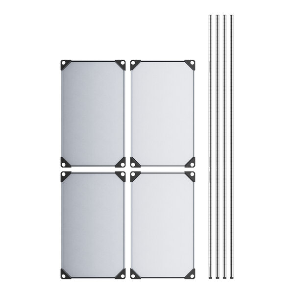 This kit includes (4) 74" stationary posts, (4) 18" x 30" solid galvanized steel shelves, and 16 pairs of split sleeves. The included split sleeves make assembly a breeze. To assemble, simply snap two split sleeves around each post at one of the incrementally notched lines. After you snap the split sleeves on, fit the shelf down over each post to hold it in place.