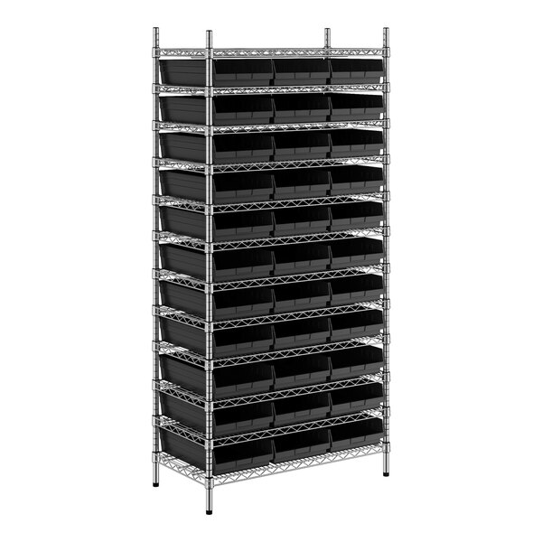 The NSF shelving unit is made of a durable, chrome-plated metal with a clear epoxy coating. It includes 12 shelves, 4 posts, and 33 black injection-molded polypropylene bins, all of which are made to commercial-grade specifications to withstand industrial conditions and for your business's long-lasting use. Each shelf can hold up to an impressive 600 lb. of evenly distributed weight.