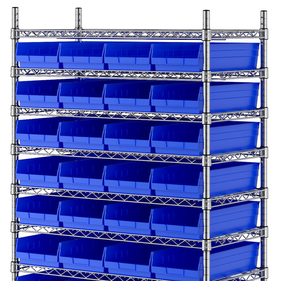 The NSF shelving unit is made of a durable, chrome-plated metal with a clear epoxy coating. It includes 12 shelves, 4 posts, and 44 blue injection-molded polypropylene bins, all of which are made to commercial-grade specifications to withstand industrial conditions and for your business's long-lasting use. Each shelf can hold up to an impressive 600 lb. of evenly distributed weight.