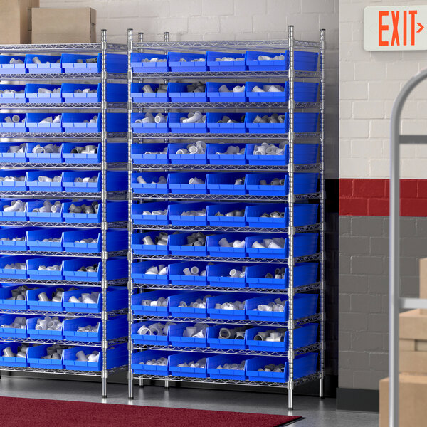 View All ItemsMaintain an organized industrial space with this Regency 18" x 36" x 74" wire shelving unit with 44 blue bins.