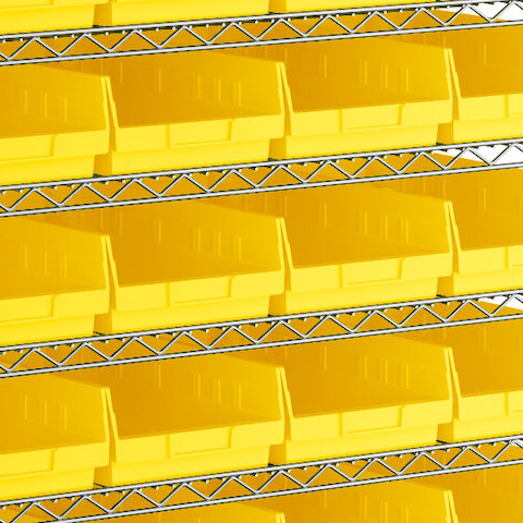 - Includes 12 shelves, 4 posts, and 44 yellow polypropylene bins