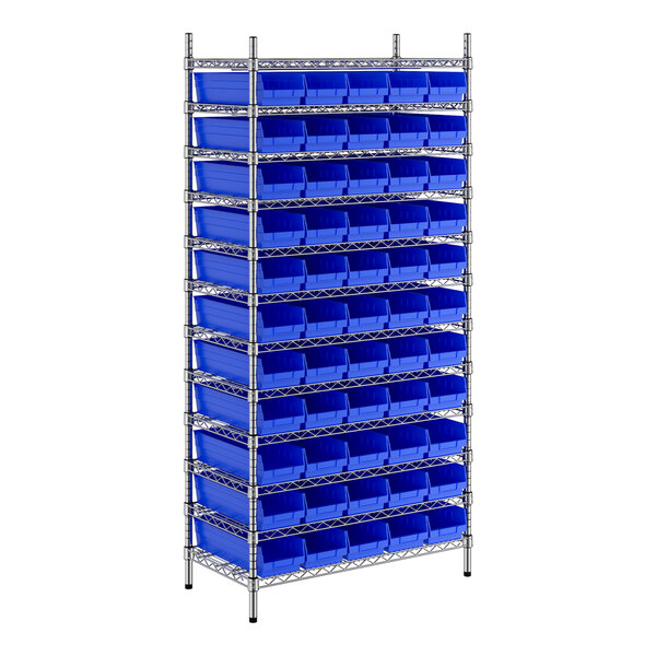 The NSF shelving unit is made of a durable, chrome-plated metal with a clear epoxy coating. It includes 12 shelves, 4 posts, and 55 blue injection-molded polypropylene bins, all of which are made to commercial-grade specifications to withstand industrial conditions and for your business's long-lasting use. Each shelf can hold up to an impressive 600 lb. of evenly distributed weight.
