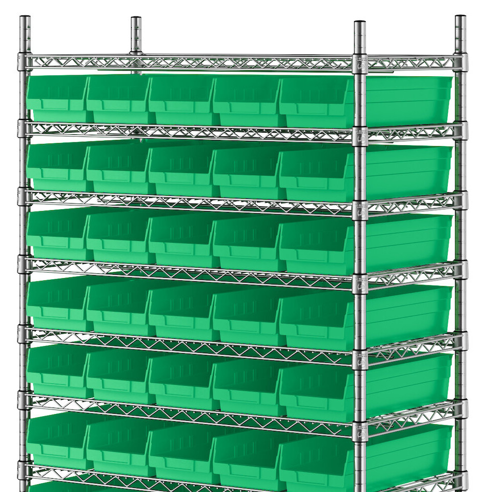 - Includes 12 shelves, 4 posts, and 55 green polypropylene bins