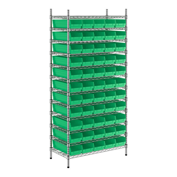The NSF shelving unit is made of a durable, chrome-plated metal with a clear epoxy coating. It includes 12 shelves, 4 posts, and 55 green injection-molded polypropylene bins, all of which are made to commercial-grade specifications to withstand industrial conditions and for your business's long-lasting use. Each shelf can hold up to an impressive 600 lb. of evenly distributed weight.
