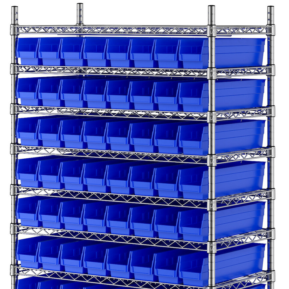 The NSF shelving unit is made of a durable, chrome-plated metal with a clear epoxy coating. It includes 12 shelves, 4 posts, and 88 blue injection-molded polypropylene bins, all of which are made to commercial-grade specifications to withstand industrial conditions and for your business's long-lasting use. Each shelf can hold up to an impressive 600 lb. of evenly distributed weight.