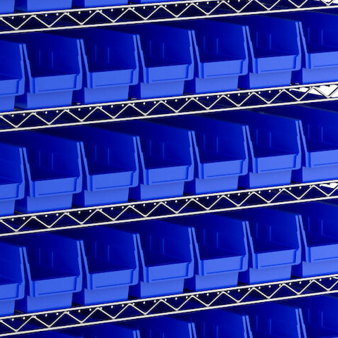 - Includes 12 shelves, 4 posts, and 88 blue polypropylene bins