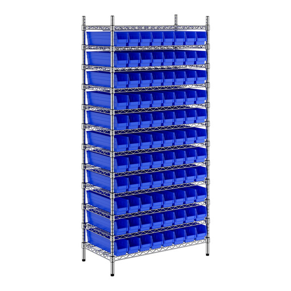 View All ItemsMaintain an organized industrial space with this Regency 18" x 36" x 74" wire shelving unit with 88 blue bins.