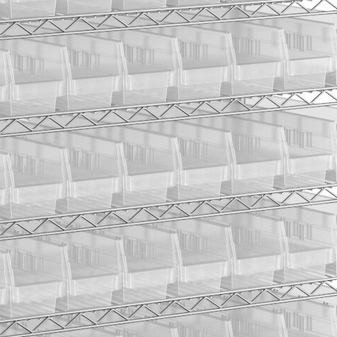 - Includes 12 shelves, 4 posts, and 88 clear polypropylene bins