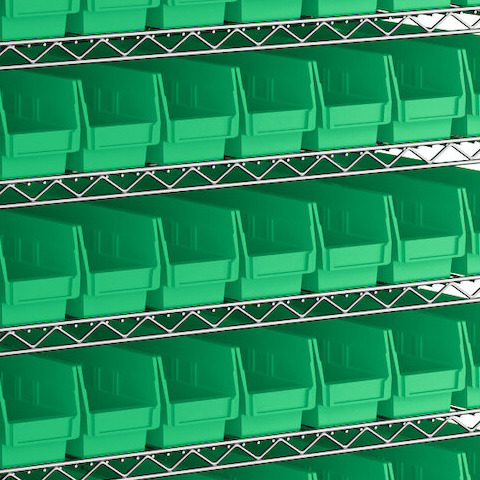 - Includes 12 shelves, 4 posts, and 88 green polypropylene bins