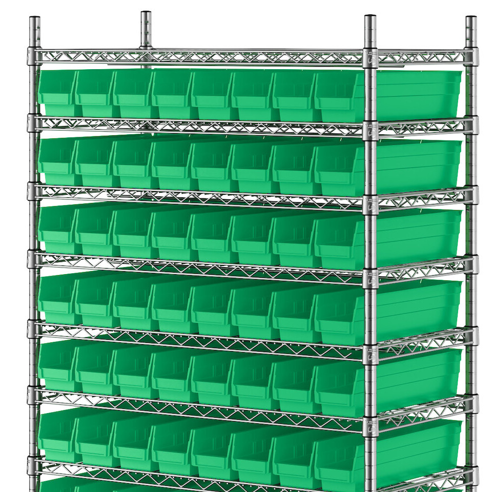 The NSF shelving unit is made of a durable, chrome-plated metal with a clear epoxy coating. It includes 12 shelves, 4 posts, and 88 green injection-molded polypropylene bins, all of which are made to commercial-grade specifications to withstand industrial conditions and for your business's long-lasting use. Each shelf can hold up to an impressive 600 lb. of evenly distributed weight.