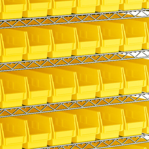 - Includes 12 shelves, 4 posts, and 88 yellow polypropylene bins