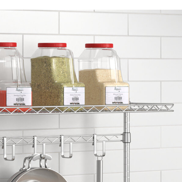 For additional overhead storage, (1) 12" x 48" chrome wire cantilever shelf is included, which can accommodate up to 150 lb. of weight, making it great for storing paper products, linens, cooking utensils, and spices. It features a retaining ledge around the perimeter to prevent its contents from sliding off. For even more space efficiency, this baker's rack includes (1) 18" chrome hanger rail and (6) 2 1/4" x 3 1/2" large chrome snap-on J-hooks that are fully adjustable to accommodate textiles, pots, pans, and serving utensils, creating an overhead storage solution without drilling into the wall.