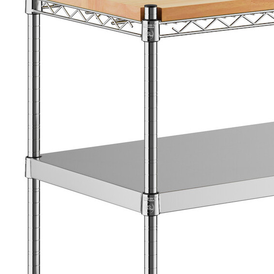 View All ItemsTrust this dependable Regency chrome baker's rack wire shelf and solid stainless steel shelf with hardwood cutting board for all your prep and dry storage needs.