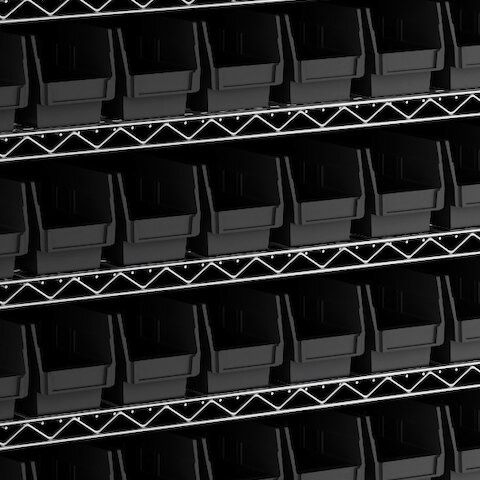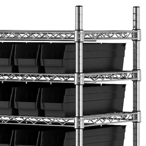 - Includes 12 shelves, 4 posts, and 110 black polypropylene bins