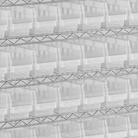 - Includes 12 shelves, 4 posts, and 110 clear polypropylene bins
