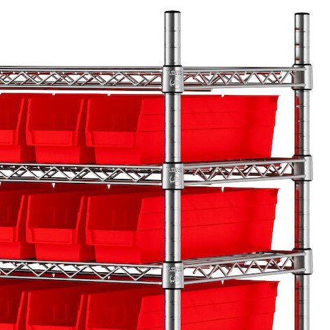 The NSF shelving unit is made of a durable, chrome-plated metal with a clear epoxy coating. It includes 12 shelves, 4 posts, and 110 red injection-molded polypropylene bins, all of which are made to commercial grade specifications to withstand industrial conditions and for your business's long-lasting use. Each shelf can hold up to an impressive 600 lb. of evenly distributed weight.