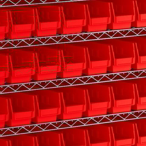 - Includes 12 shelves, 4 posts, and 110 red polypropylene bins