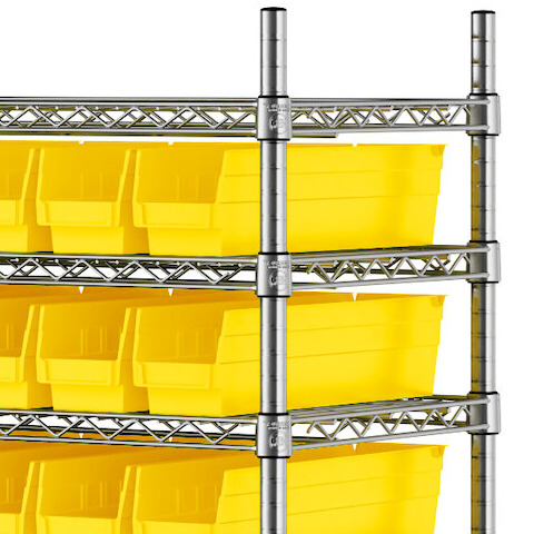 The NSF shelving unit is made of a durable, chrome-plated metal with a clear epoxy coating. It includes 12 shelves, 4 posts, and 110 yellow injection-molded polypropylene bins, all of which are made to commercial-grade specifications to withstand industrial conditions and for your business's long-lasting use. Each shelf can hold up to an impressive 600 lb. of evenly distributed weight.