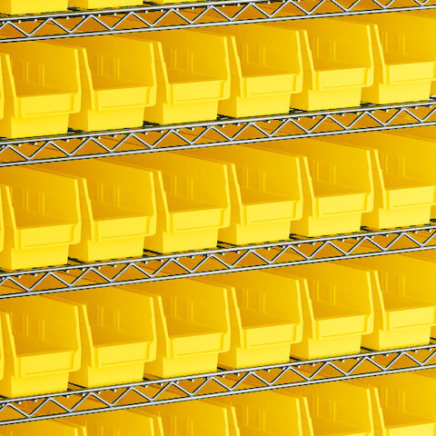 - Includes 12 shelves, 4 posts, and 110 yellow polypropylene bins