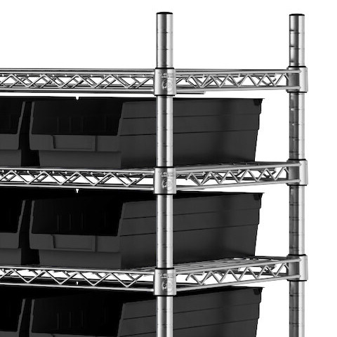 The NSF shelving unit is made of a durable, chrome-plated metal with a clear epoxy coating. It includes 12 shelves, 4 posts, and 66 black injection-molded polypropylene bins, all of which are made to commercial-grade specifications to withstand industrial conditions and for your business's long-lasting use. Each shelf can hold up to an impressive 600 lb. of evenly distributed weight.