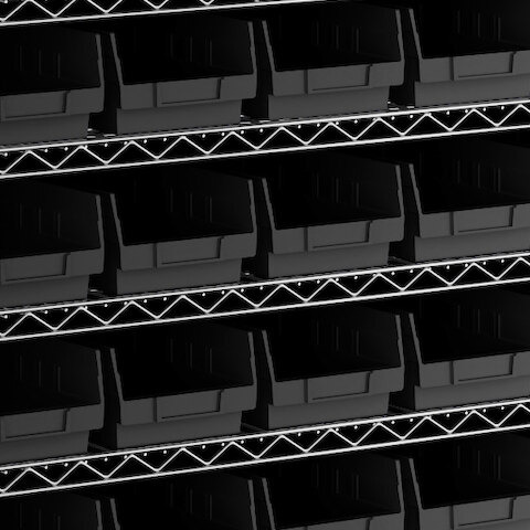 - Includes 12 shelves, 4 posts, and 66 black polypropylene bins