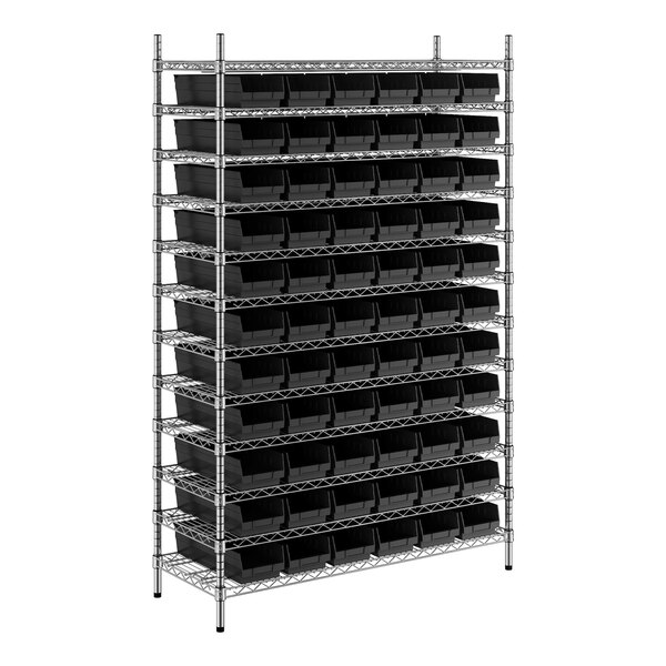View All ItemsMaintain an organized industrial space with this Regency 18" x 48" x 74" wire shelving unit with 66 black bins.