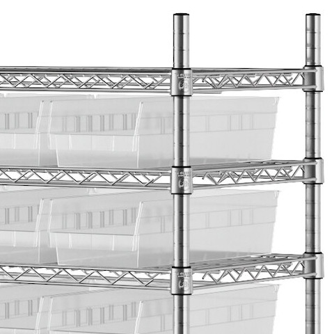 The NSF shelving unit is made of a durable, chrome-plated metal with a clear epoxy coating. It includes 12 shelves, 4 posts, and 66 clear injection-molded polypropylene bins, all of which are made to commercial-grade specifications to withstand industrial conditions and for your business's long-lasting use. Each shelf can hold up to an impressive 600 lb. of evenly distributed weight.