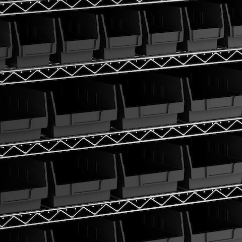 • Includes 12 shelves, 4 posts, and 91 black polypropylene bins