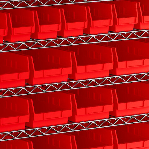 - Includes 12 shelves, 4 posts, and 91 red polypropylene bins