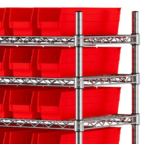 The NSF shelving unit is made of a durable, chrome-plated metal with a clear epoxy coating. It includes 12 shelves, 4 posts, and 91 red injection-molded polypropylene bins, all of which are made to commercial grade specifications to withstand industrial conditions and for your business's long-lasting use. Each shelf can hold up to an impressive 600 lb. of evenly distributed weight.