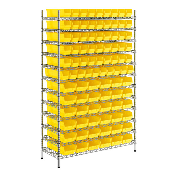 View All ItemsMaintain an organized industrial space with this Regency 18" x 48" x 74" wire shelving unit with 91 yellow bins.