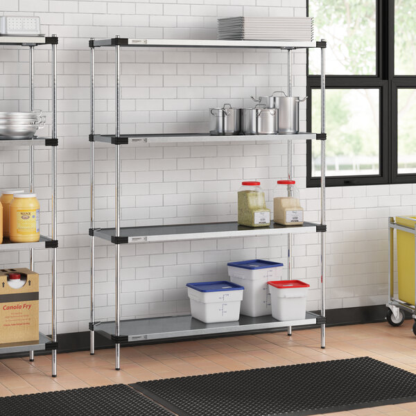 This reliable and versatile unit boasts a durable construction, allowing you to store your essential products with peace of mind. Plus, assembly is fast and easy, so you can start using the shelving unit quickly. Whether you're in a kitchen, retail, or industrial environment, this shelving unit is a reliable and efficient storage solution.