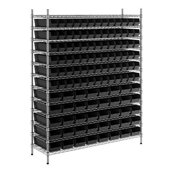 View All ItemsMaintain an organized industrial space with this Regency 18" x 60" x 74" wire shelving unit with 118 black bins.
